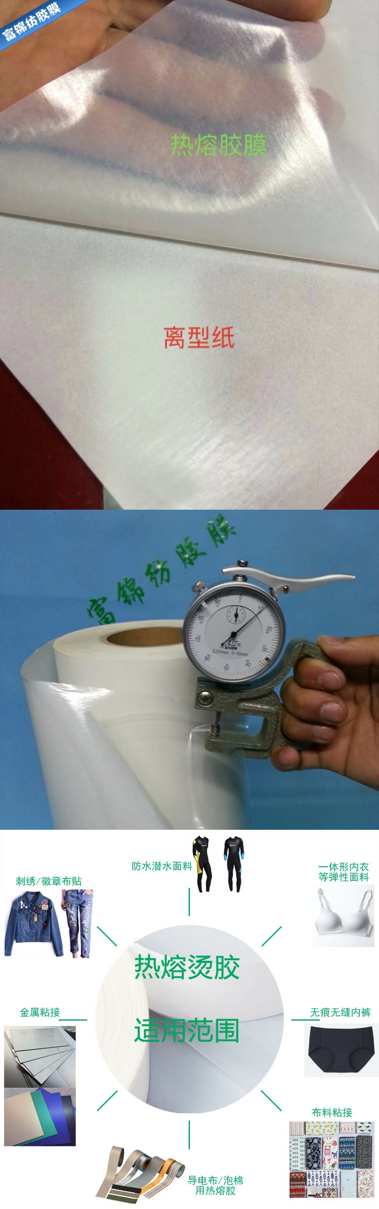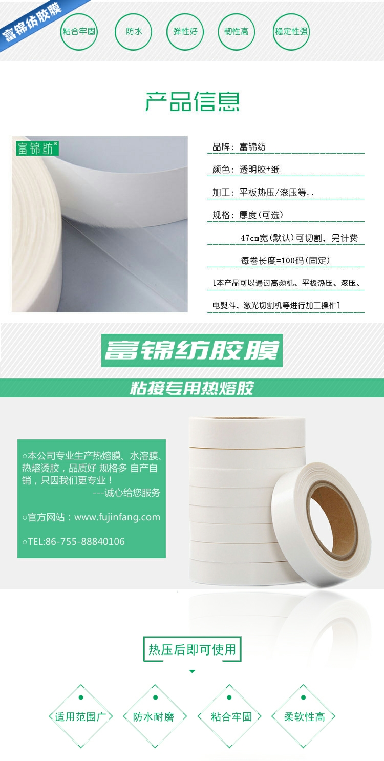 高分子環(huán)保熱熔膠膜具有兩面均能接著之特性,并接著力相當強、耐候性強、耐水洗、干洗、耐酸、耐堿、抗張力、融點適中、操作方便等優(yōu)點。