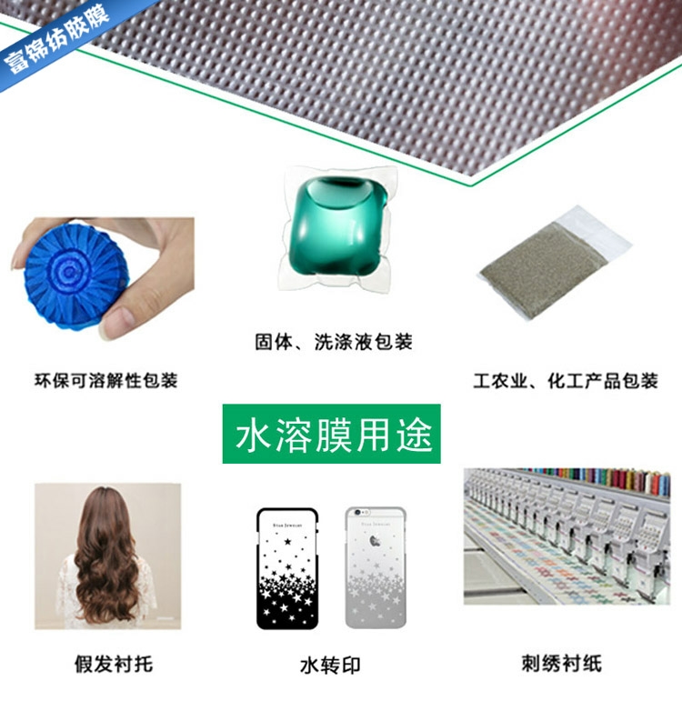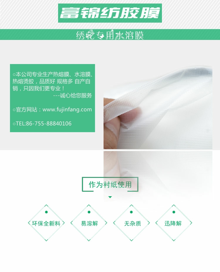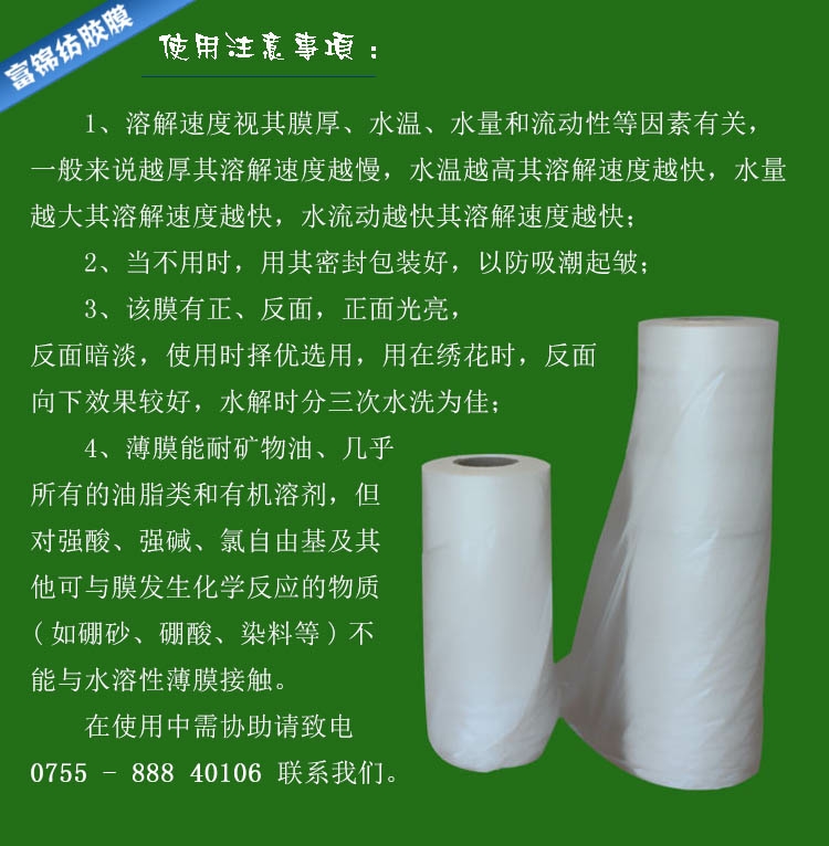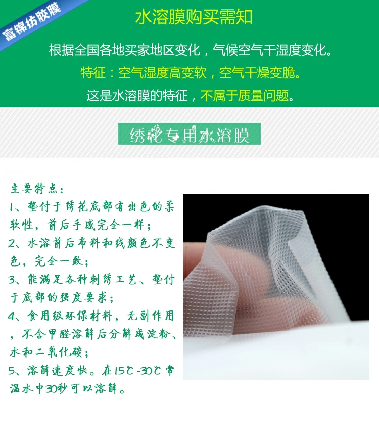 刺繡冷水溶是為了適應(yīng)繡花機使用的快溶型自來水可溶解薄膜,此膜在常溫(15℃-30℃)水下30秒鐘即可溶化(若水量大、流動性好更快),2分鐘徹底溶解干凈,繡品上無任何殘余物無有害物質(zhì)產(chǎn)生,可用于臺布繡、花邊、網(wǎng)布、匹布的佳品。幾乎已全面代替?zhèn)鹘y(tǒng)的熱煮高溫水溶紙襯,熱煮后刺繡成品易起皺折,使個別產(chǎn)品出現(xiàn)脫色、費時且不美觀,比傳統(tǒng)熱煮水溶紙襯來得更方便,而且常溫下完全可以徹底溶解干凈,并能大大提高繡品的優(yōu)品率。