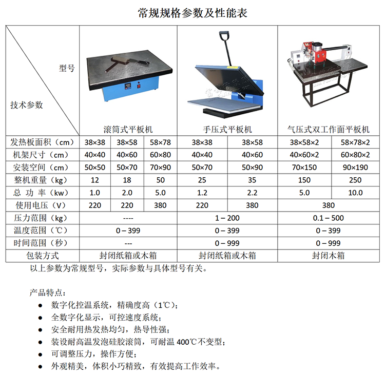 平板燙膜機有三款型號的產(chǎn)品,分別是“氣動型”、“手壓型”和“平板型”,其原理是:帶有熱熔膜的繡品通過壓緊到的發(fā)熱的鋁板上,繡品上熱熔膜會被燙到鋁板上,從而使繡品干凈無殘熱熔膜。具有機械成本低免保養(yǎng)、智能溫控、發(fā)熱板一體成形、穩(wěn)定耐用、發(fā)熱均勻等優(yōu)點。具體請閣下查閱下表: